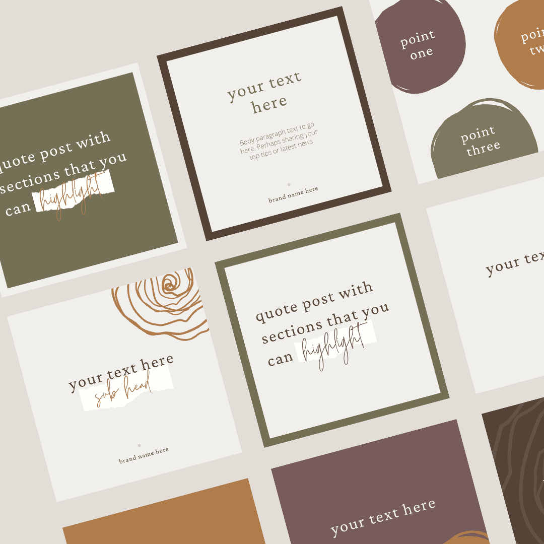 Into The Woods is an organic, natural and hand-crafted social media template inspired by woodland forests and the organic forms found in nature. This kit has a grounded, organic and natural feel.
