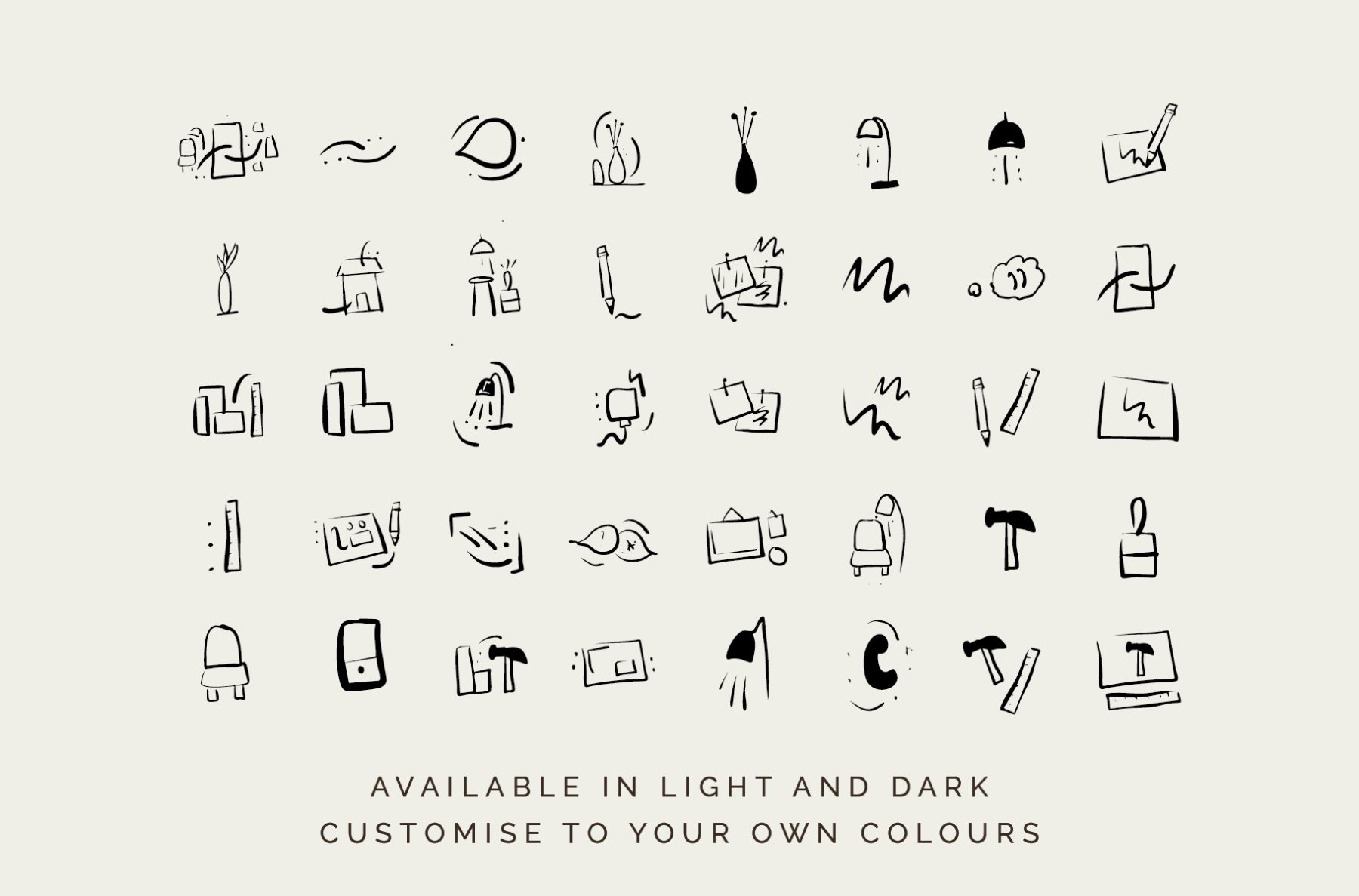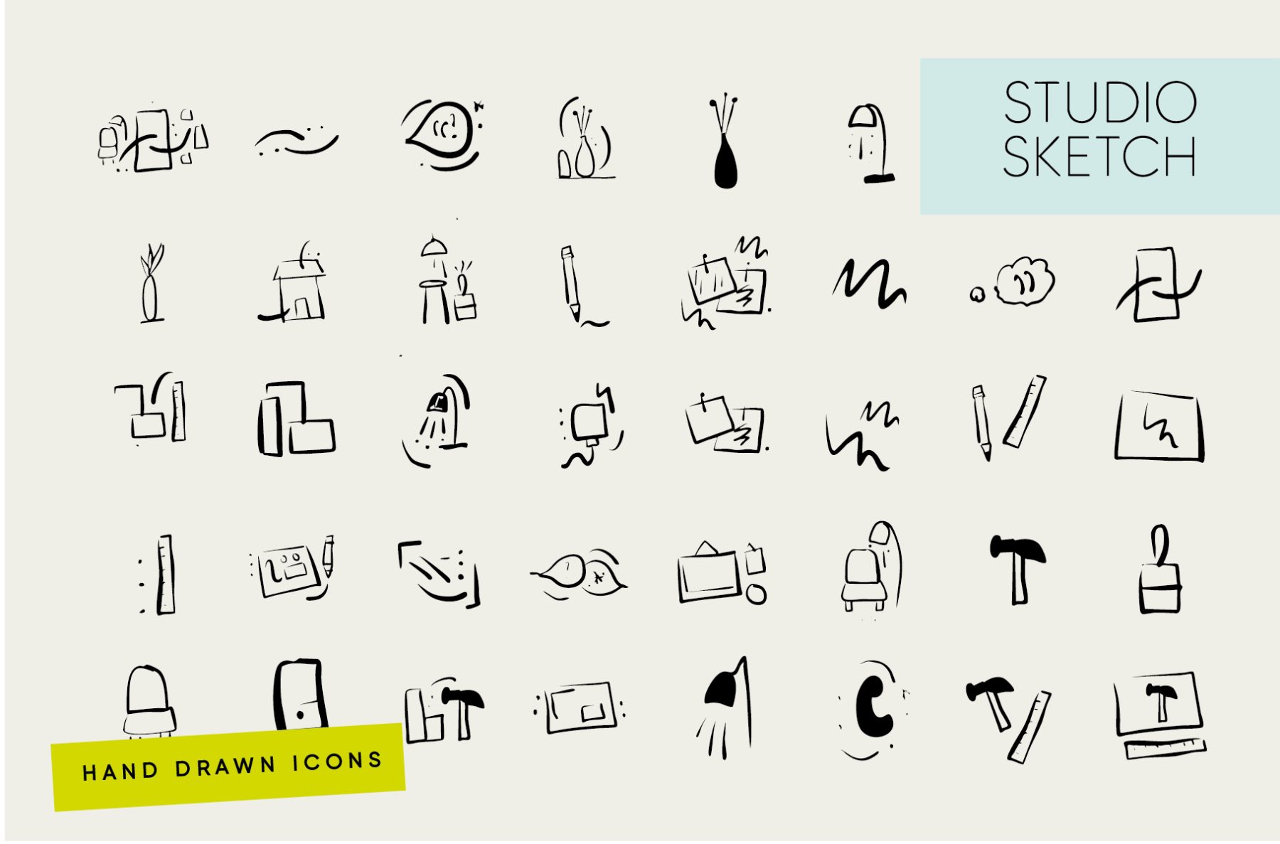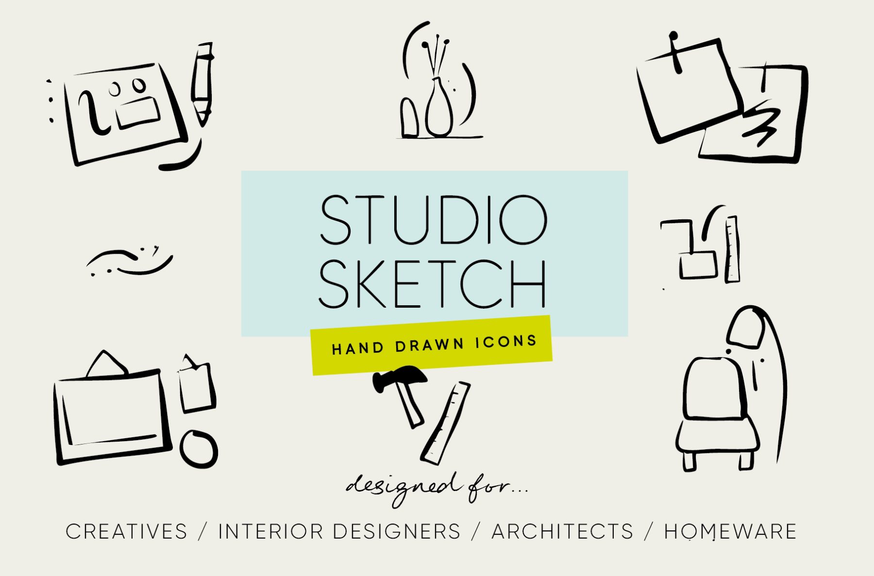 Studio Sketch is a hand-drawn icon set and features architectural, interior design, homeware, diy, making, graphic design and business icons to use on your website, logo or marketing materials.